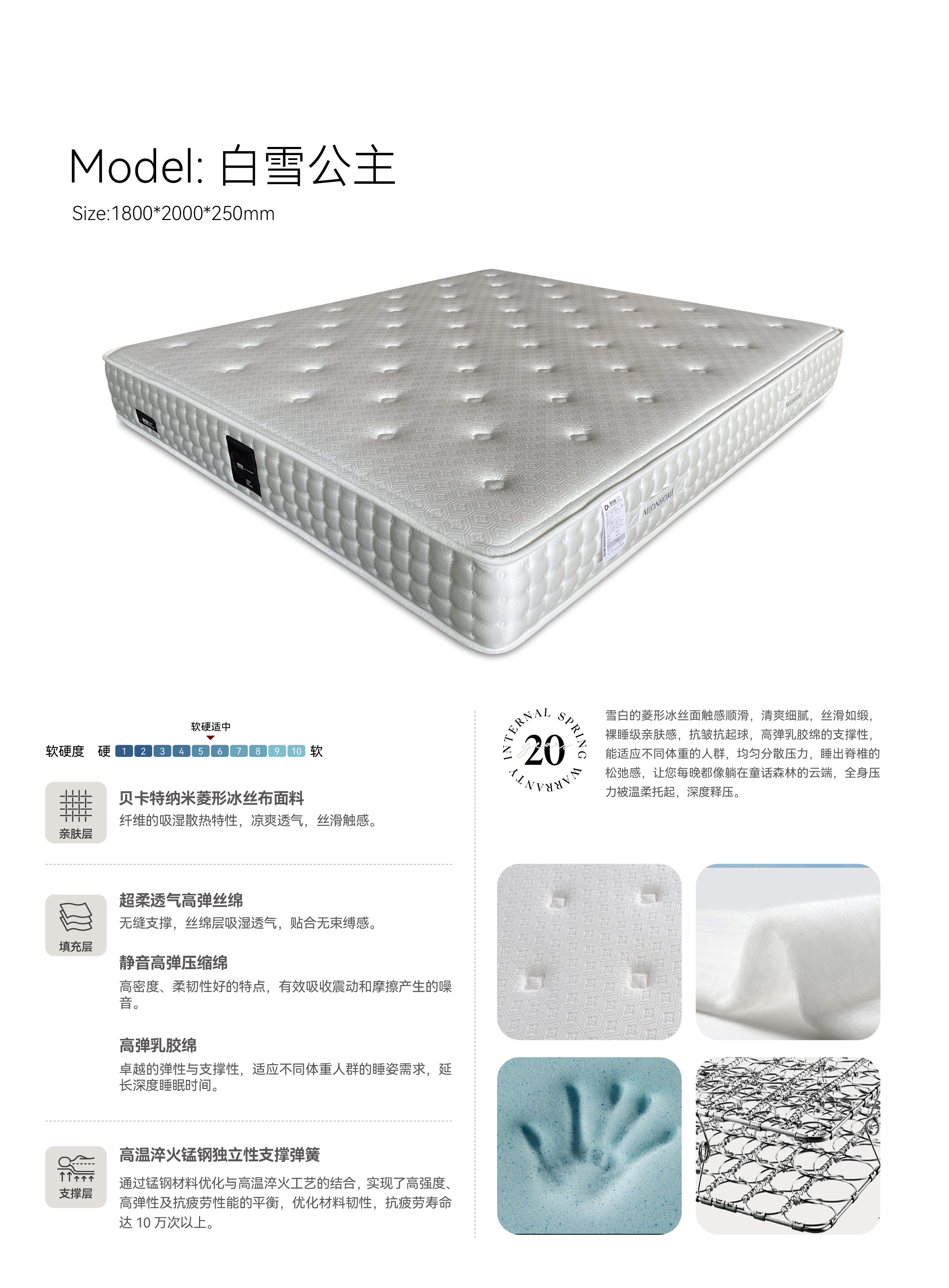 贝卡特冰丝面料,吸湿散热 高弹乳胶棉,卓越的弹性与支撑性 高温淬火锰钢独立弹簧,抗疲劳性极佳!